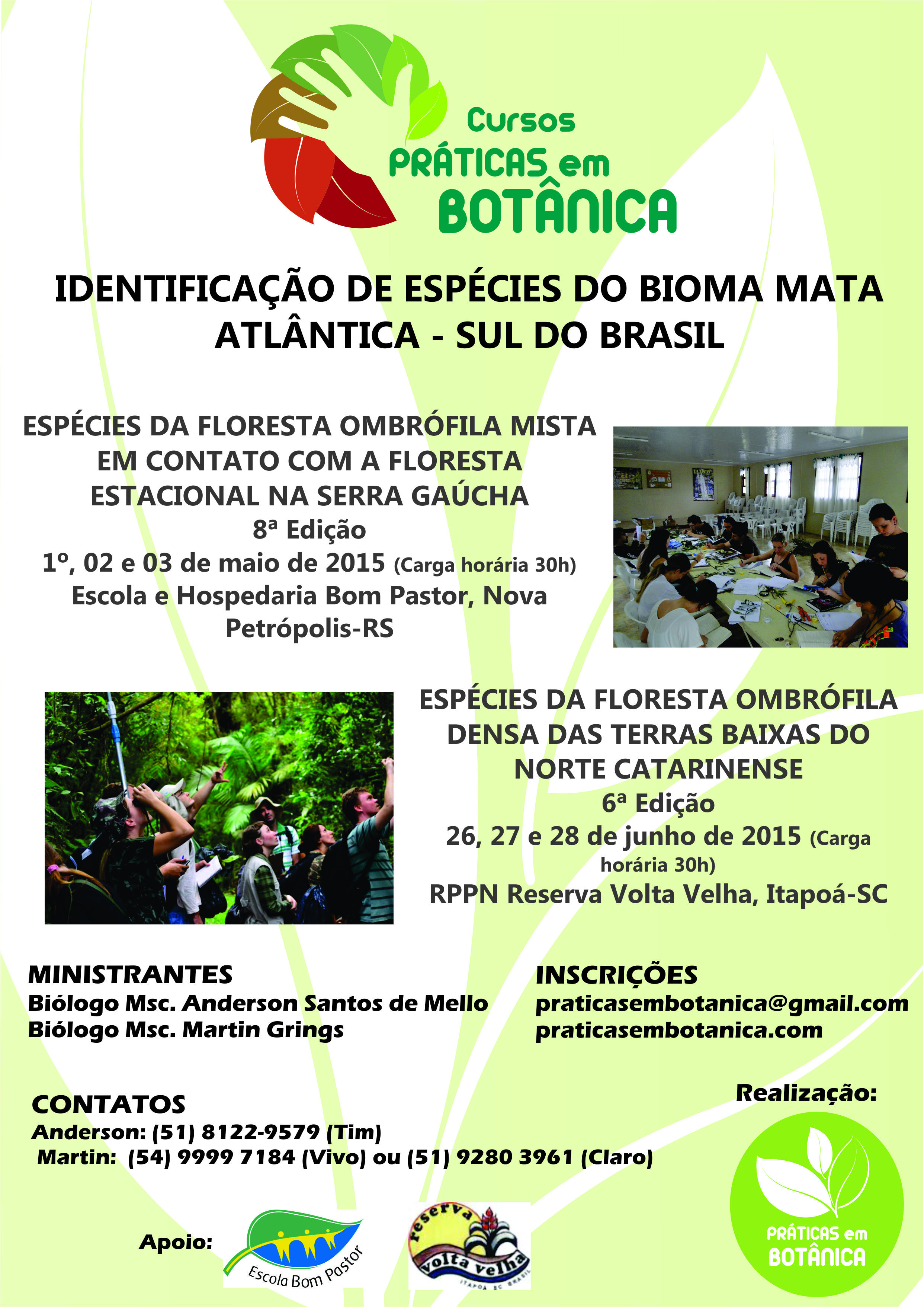 A equipe Práticas em Botânica preparou novos cursos para o 1° semestre de 2015, ambos de imersão, com aulas teóricas e práticas em dois locais fantásticos e muito tradicionais de nossos cursos, Nova Petrópolis-RS, terra das Araucárias multisseculares e Itapoá-SC, com a exuberante flora das Planícies litorâneas. Não perca! Maiores informações clique aqui.