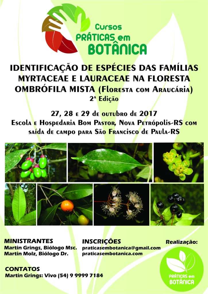 Mais um curso na primavera!! A equipe Práticas em Botânica volta a oferecer curso voltado para duas famílias com alta riqueza, importância ecológica e econômica e que geram muitas dúvidas para profissionais e estudantes no momento da identificação: Myrtaceae e Lauraceae. O curso terá três dias de duração e ocorrerá no município de Nova Petrópolis, na Serra Gaúcha, com saída de campo para São Francisco de Paula-RS, nos Campos de Cima da Serra, locais de concentração de espécies de ambas famílias. Não perca esta oportunidade de aprender dicas de reconhecimento em campo e em laboratório para duas das principais famílias de espécies arbóreas no Sul do Brasil!