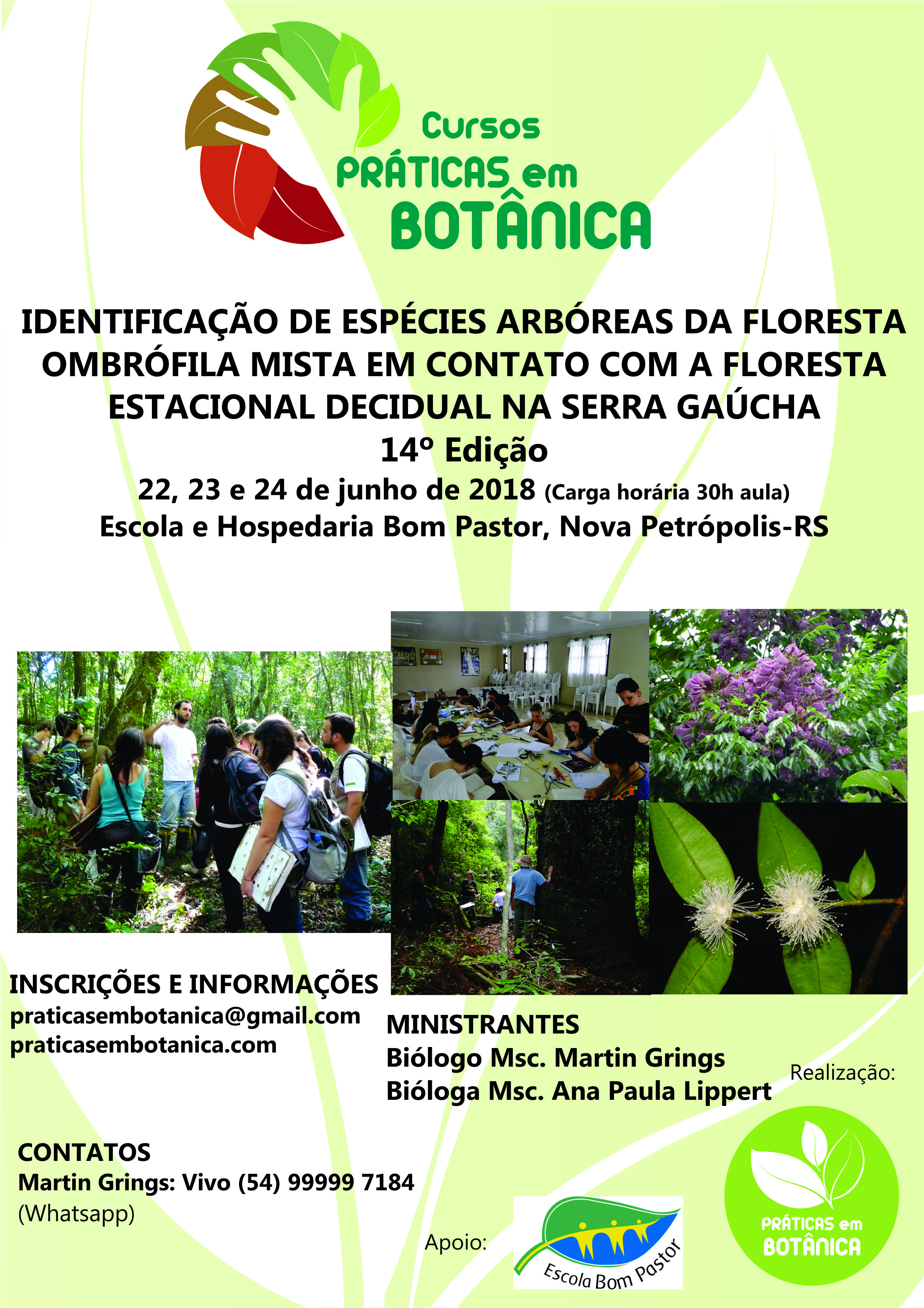 A Flora Arbórea do Estado Rio Grande do Sul possui mais de 500 espécies nativas! Destas, em torno de 200 ocorrem nas florestas com araucária e florestas de encosta do município de Nova Petrópolis-RS. Aproveite a oportunidade para estudar e conhecer as árvores nativas da serra gaúcha, aprendendo dicas para a sua identificação a campo e características ecológicas importantes das espécies! Trata-se de um curso de imersão de 3 dias com hospedagem e alimentação incluídas. Um ambiente de troca de conhecimento e novos contatos!