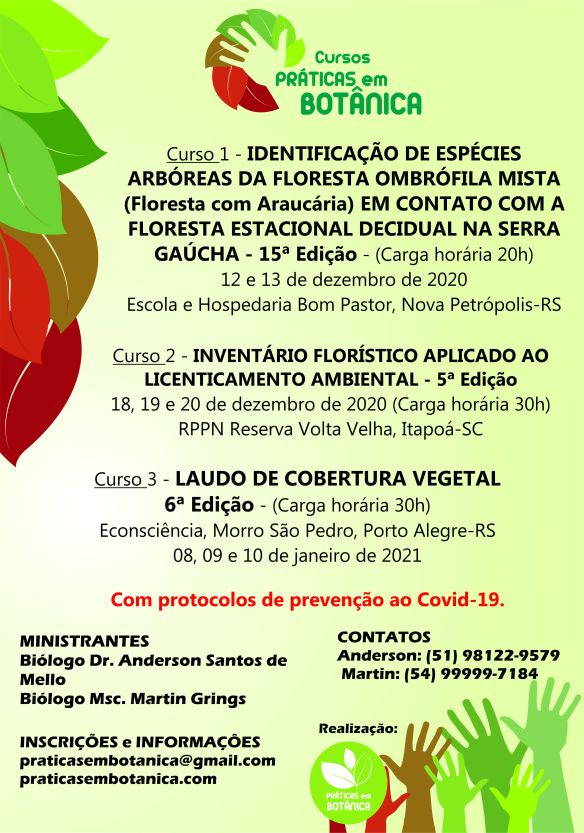 Com grande satisfação, informamos as datas para os cursos do final de 2020 e início de 2021. Os cursos representam a retomada das atividades do ramos de cursos da empresa, depois de mais de 9 meses de pandemia. Todos os cuidados e restrições quanto à prevenção ao Covid-19 serão seguidos, através de protocolos de distanciamento e higiene, além de manutenção de ambientes limpos e arejados, com aulas ao ar livre em grande parte do cronograma. Participe!