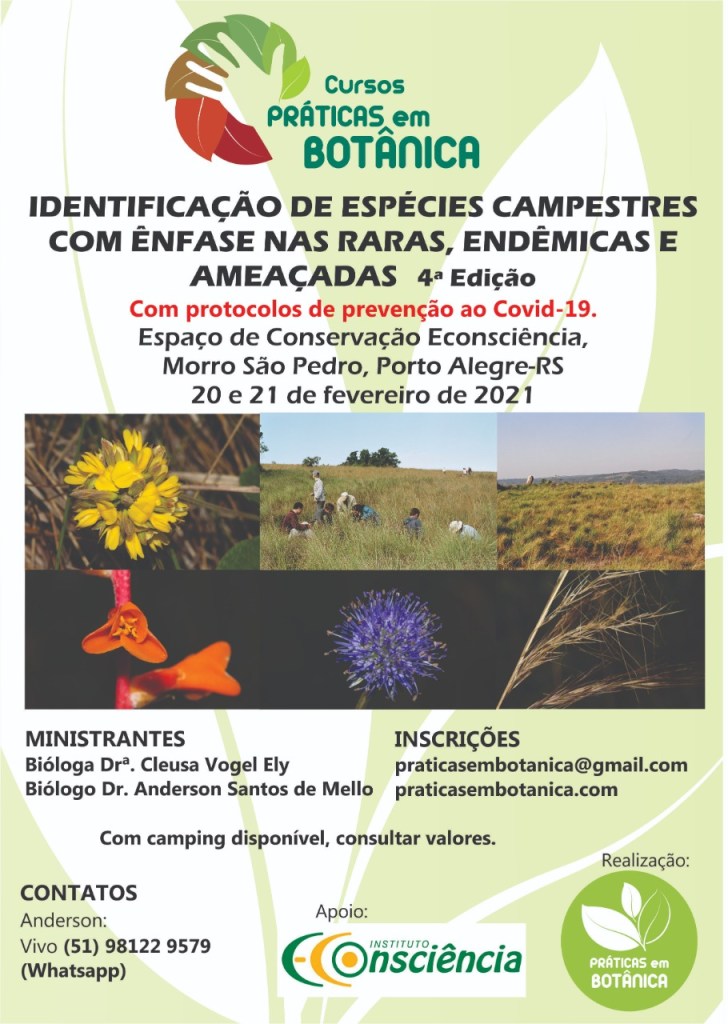 Estamos lançando o segundo curso do ano, voltado para identificação de espécies campestres do Rio Grande do Sul! Estas formações são as que apresentam o maior número de espécies com interesse para a conservação, raras, endêmicas e ameaçadas de extinção. Outrora negligenciados em levantamentos voltados para o licenciamento ambiental, os campos nativos tem sido cada vez mais incorporados ao dia-a-dia dos consultores ambientais, o que torna este curso bastante interessante tanto para quem está iniciando no mercado de trabalho quanto para quem já está inserido e se depara com uma vegetação totalmente diferente do que está acostumado. Todos os cuidados e restrições quanto à prevenção ao Covid-19 serão seguidos, através de protocolos de distanciamento e higiene, além de manutenção de ambientes limpos e arejados, com aulas ao ar livre em grande parte do cronograma. Participe!